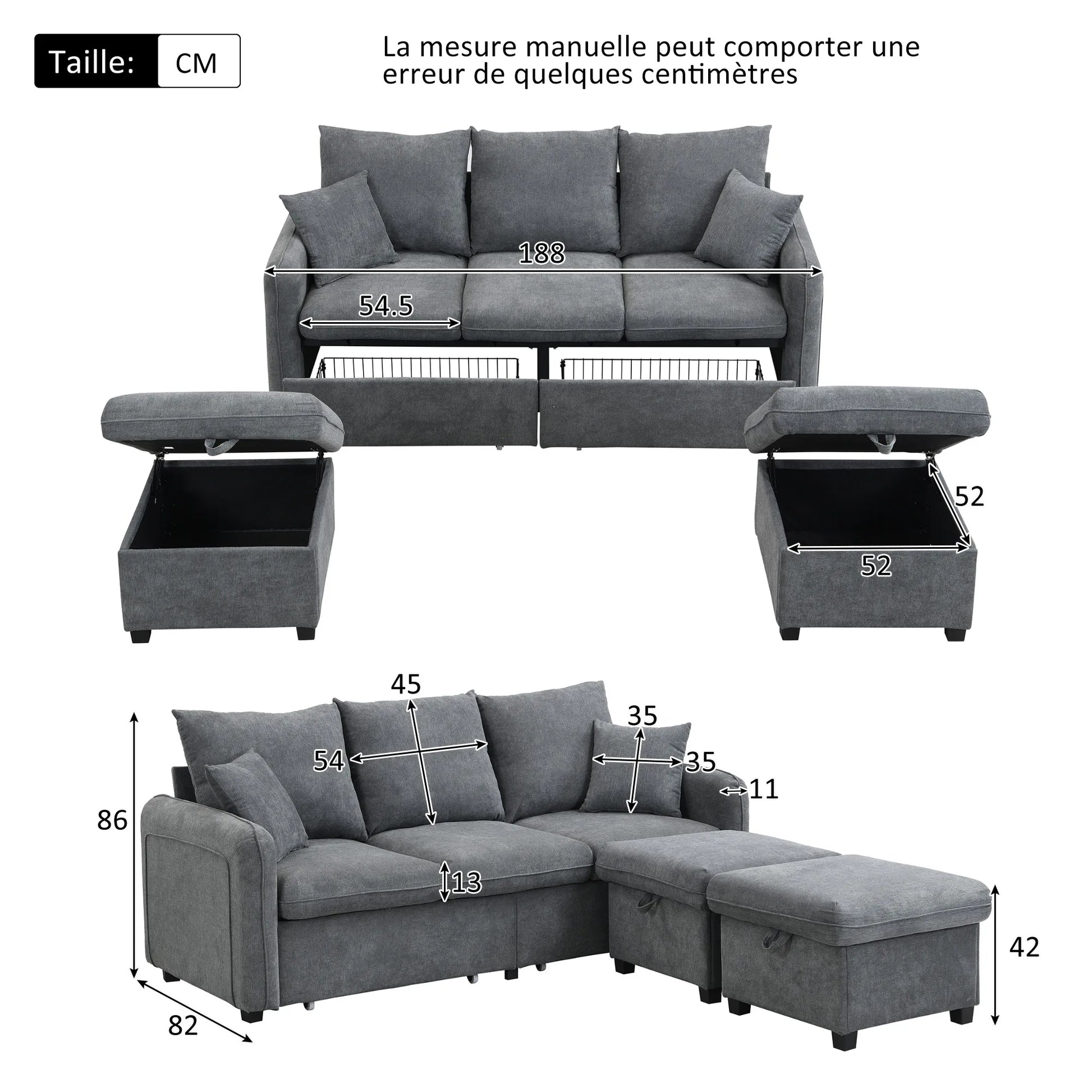 Grâce à sa structure modulable — un canapé trois places accompagné de deux poufs indépendants — il se transforme facilement en lit d’appoint ou en canapé d’angle spacieux. Chaque configuration est intuitive, fluide et élégante.